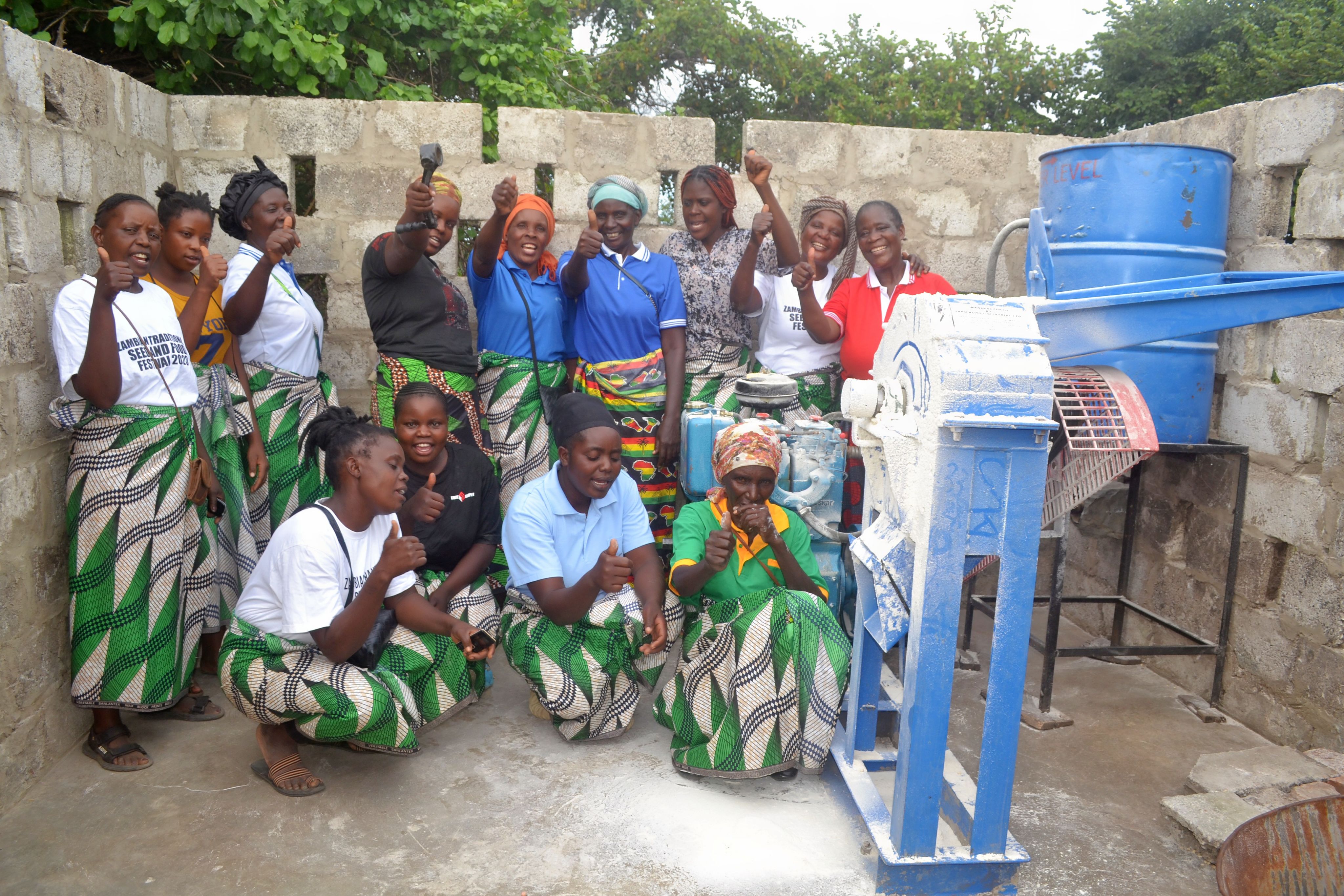 Kapyanga women stand beside their hammer mill.